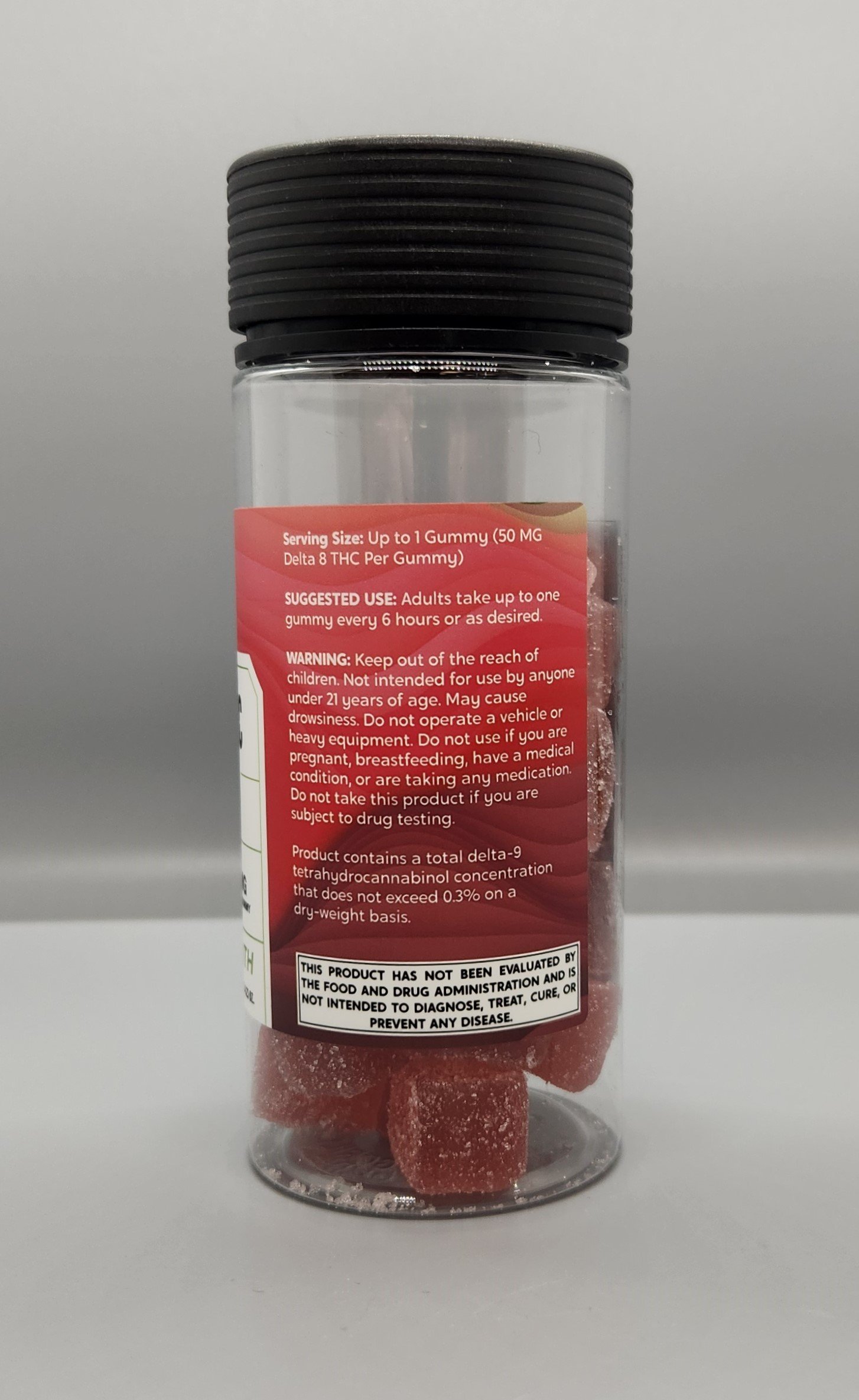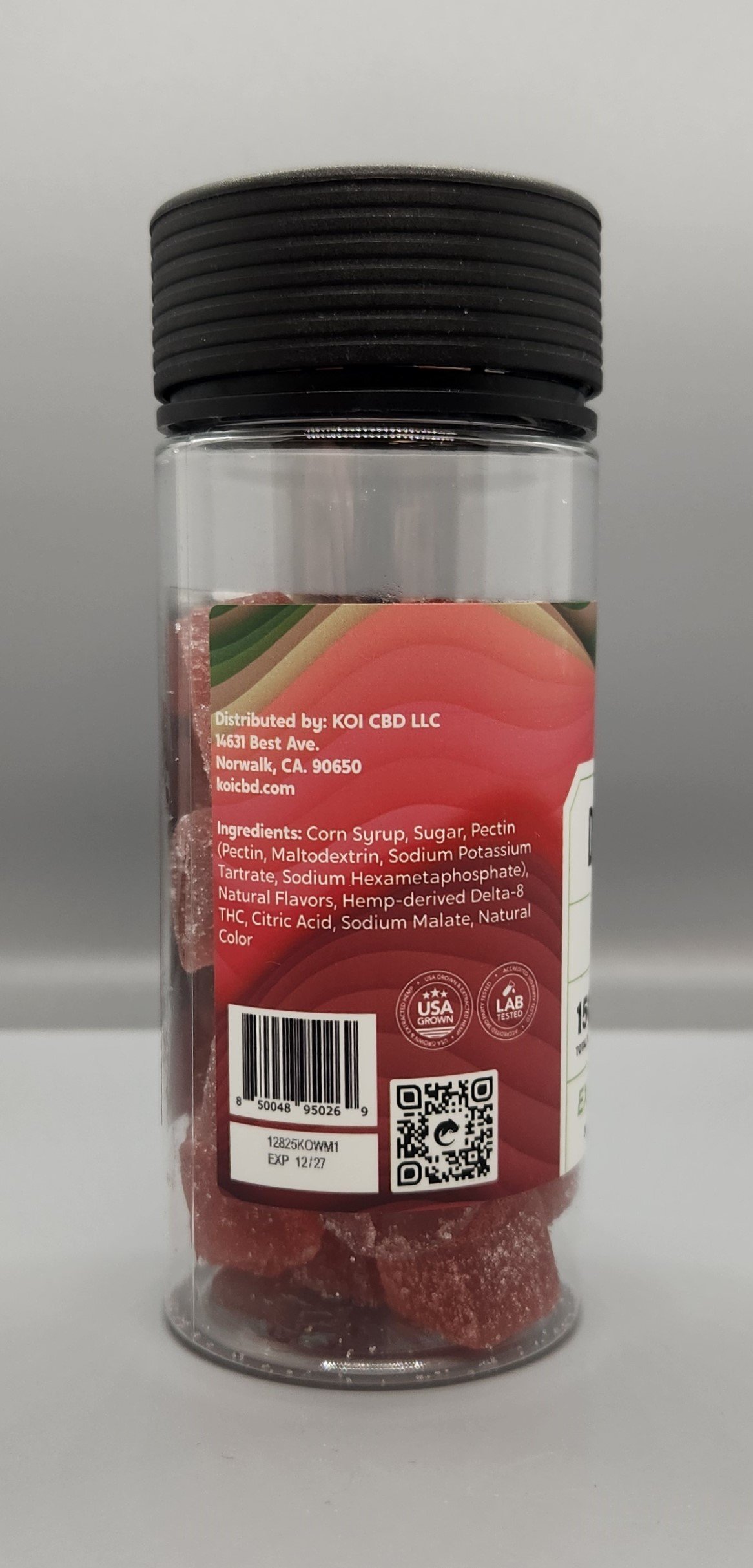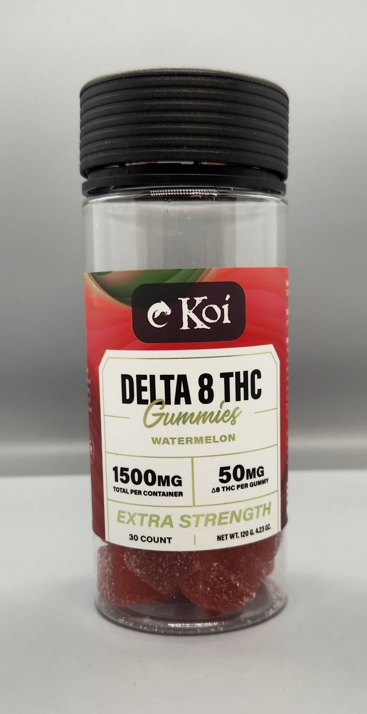 Koi’s Delta 8 Extra Strength gummies are now 50mg of Delta 8 per gummy. They come in a convenient, resealable, plastic, child proof jar. The strawberry banana flavor will remind you of a tropical Pina Colada. Each jar contains 30 gummies.